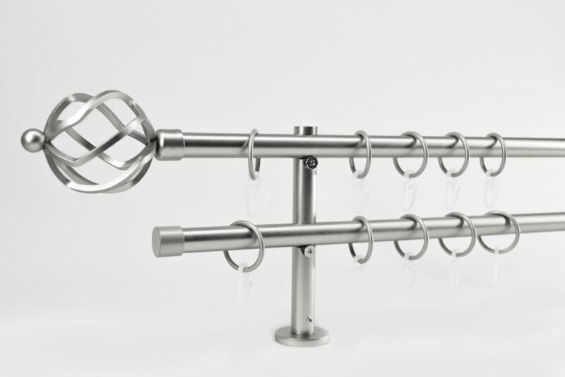 A szett tartalma: - 2 db nikkel-matt színű 16 mm Ø rúd a választott méretben - 2 db nikkel-matt New Orleans végzáró (5 cm) - 2 db nikkel- matt Kansas végzáró (2 cm)- a hátsó rúdra - 2 db dupla nikkel-matt nyitott tartó (11,5/17,5 cm) - nikkel-matt karikák ráncszedőkampóval (rudanként, 10 cm-ként 1 db) - a szereléshez szükséges csavarok és tiplik 240 cm karnishossz felett