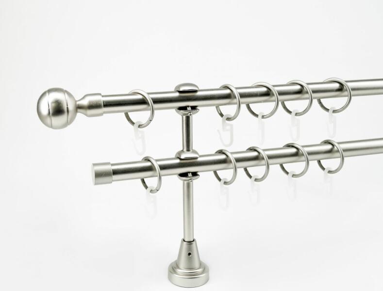 A szett tartalma: - 2 db nikkel-matt színű 16 mm Ø rúd a választott méretben - 2 db nikkel-matt Szeged végzáró (9 cm) - 2 db nikkel- matt Kansas végzáró (2 cm)- a hátsó rúdra - 2 db dupla nikkel-matt block tartó (8/14 cm) - nikkel-matt karikák ráncszedőkampóval (rudanként, 10 cm-ként 1 db) - a szereléshez szükséges csavarok és tiplik 240 cm karnishossz felett 3 db tartót