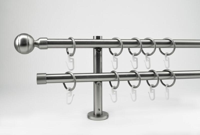 A szett tartalma: - 2 db nikkel-matt színű 16 mm Ø rúd a választott méretben - 2 db nikkel-matt New Orleans végzáró (5 cm) - 2 db nikkel- matt Kansas végzáró (2 cm)- a hátsó rúdra - 2 db dupla nikkel-matt block tartó (8/14 cm) - nikkel-matt karikák ráncszedőkampóval (rudanként, 10 cm-ként 1 db) - a szereléshez szükséges csavarok és tiplik 240 cm karnishossz felett 3 db ta