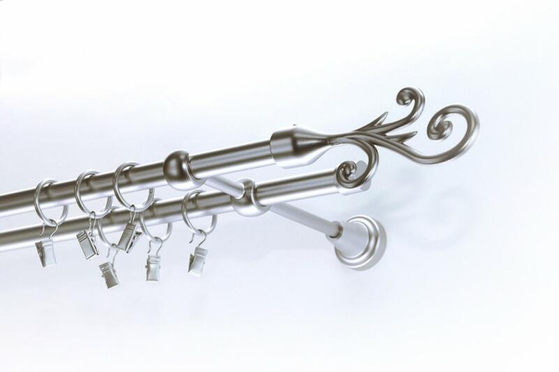 A szett tartalma: - 2 db nikkel-matt színű 16 mm Ø rúd a választott méretben - 2 db nikkel-matt Memphis végzáró (5,5 cm) - 2 db nikkel- matt Kansas végzáró (2 cm)- a hátsó rúdra - 2 db dupla nikkel-matt lapostartó (8,5/14,5 cm) - nikkel-matt karikák ráncszedőkampóval (rudanként, 10 cm-ként 1 db) - a szereléshez szükséges csavarok és tiplik 240 cm karnishossz felett 3 db t