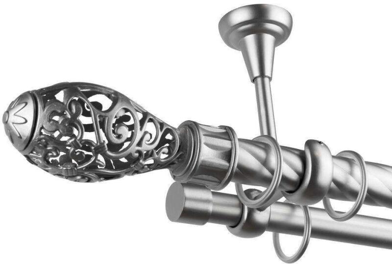 A szett tartalma: - 2 db nikkel-matt színű 19 mm Ø rúd a választott méretben - 2 db nikkel-matt Oslo végzáró (3 cm) - 2 db nikkel- matt Köln végzáró (2 cm)- a hátsó rúdra - 2 db dupla nikkel-matt block tartó (12/18 cm) - nikkel-matt karikák ráncszedőkampóval (rudanként, 10 cm-ként 1 db) - a szereléshez szükséges csavarok és tiplik 240 cm karnishossz felett 3 db tartót t