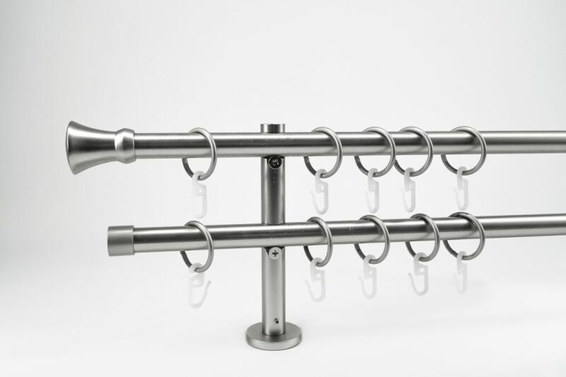 A szett tartalma: - 2 db inox színű 19 mm Ø rúd a választott méretben - 2 db inox Stockholm végzáró (6 cm) - 2 db inox Köln végzáró (2 cm)- a hátsó rúdra - 2 db dupla inox block tartó (12/18 cm) - inox karikák ráncszedőkampóval (rudanként, 10 cm-ként 1 db) - a szereléshez szükséges csavarok és tiplik 240 cm karnishossz felett 3 db tartót tartalmaz a csomag. Webáruházu