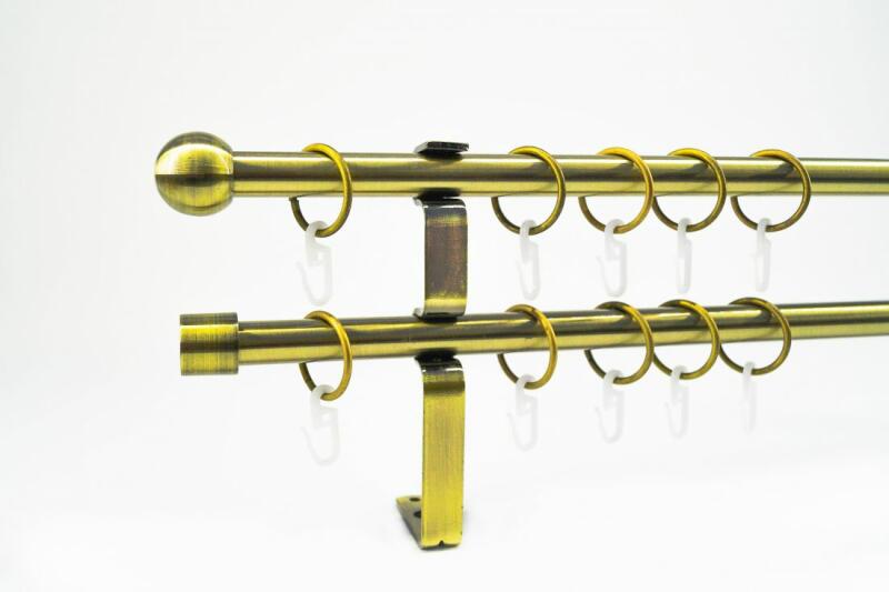 A szett tartalma: - 2 db óarany színű 16 mm Ø rúd a választott méretben - 2 db óarany Veszprém végzáró (2,5 cm) - 2 db óarany Kansas végzáró (2 cm)- a hátsó rúdra - 2 db dupla óarany lapostartó (8,5/14,5 cm) - óarany karikák és ráncszedő kampók (rudanként, 10 cm-ként 1 db) - a szereléshez szükséges csavarok és tiplik 240 cm karnishossz felett 3 db tartót tartalmaz