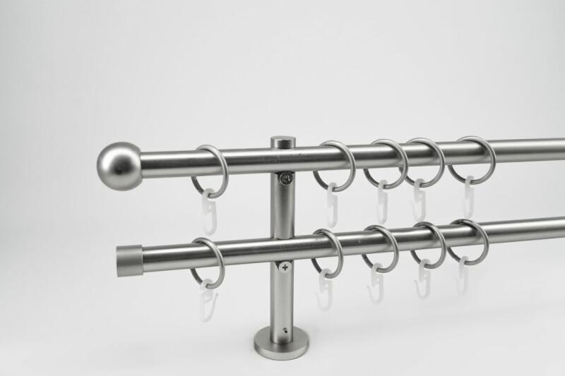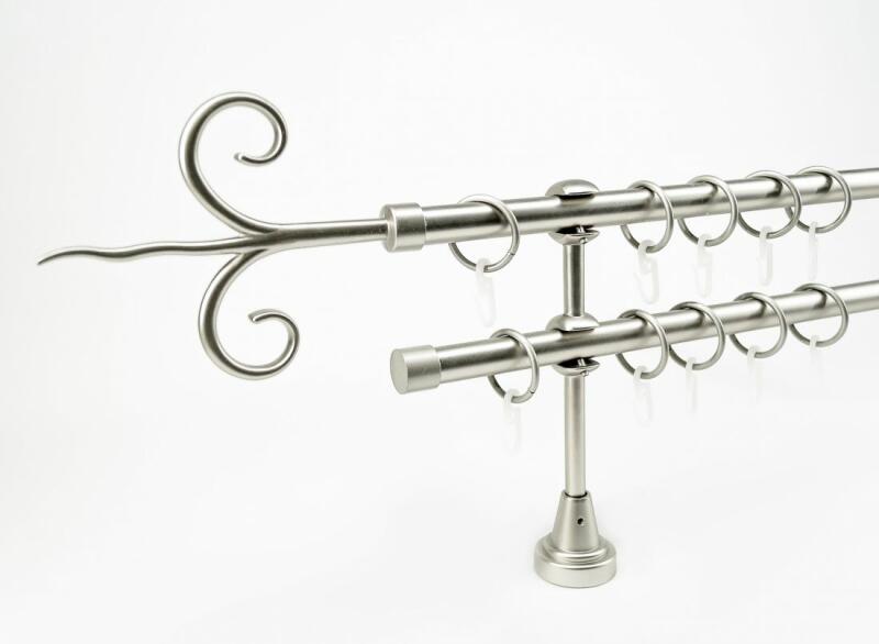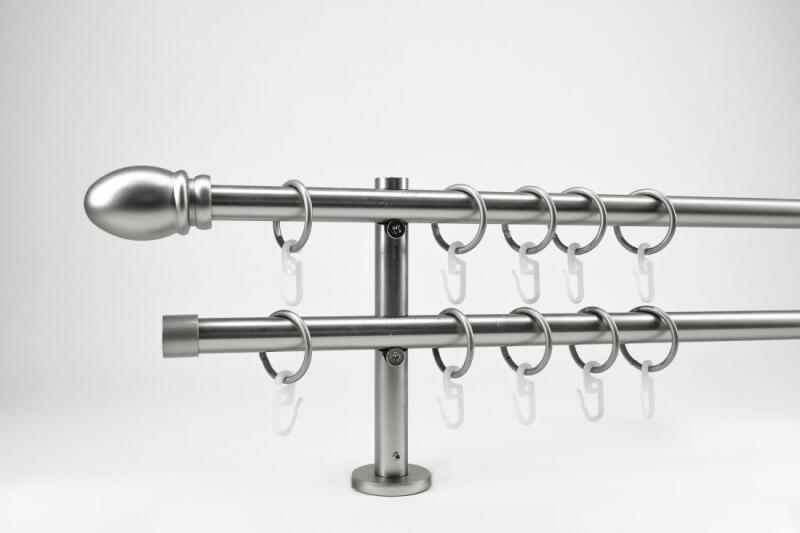 A szett tartalma: - 2 db nikkel-matt színű 16 mm Ø rúd a választott méretben - 2 db nikkel-matt St. Louis végzáró (5 cm) - 2 db nikkel- matt Kansas végzáró (2 cm)- a hátsó rúdra - 2 db dupla nikkel-matt block tartó (8/14 cm) - nikkel-matt karikák ráncszedőkampóval (rudanként, 10 cm-ként 1 db) - a szereléshez szükséges csavarok és tiplik 240 cm karnishossz felett 3 db tart