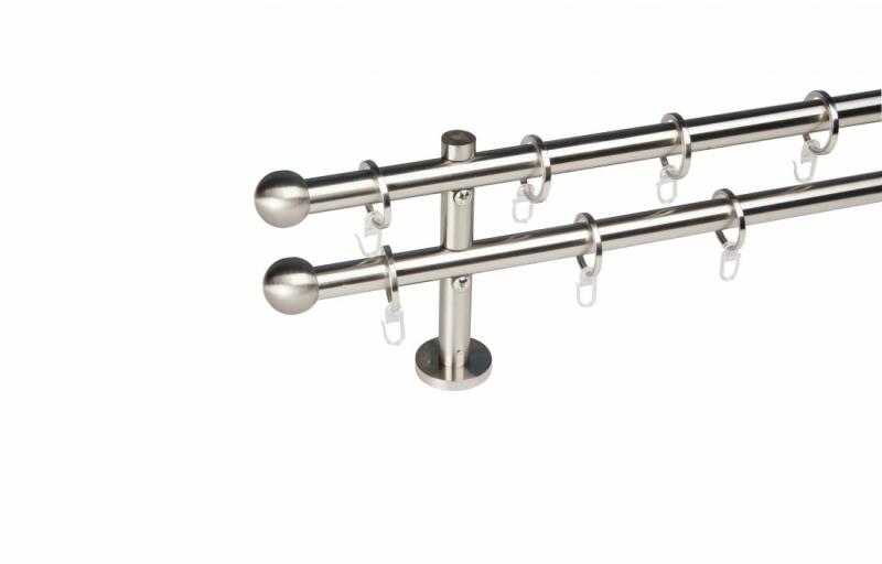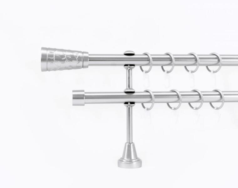 A szett tartalma: - 2 db nikkel-matt színű 19 mm Ø rúd a választott méretben - 2 db nikkel-matt Belgrad végzáró (7 cm) - 2 db nikkel- matt Köln végzáró (2 cm)- a hátsó rúdra - 2 db dupla nikkel-matt nyitott tartó (11/17 cm) - nikkel-matt karikák ráncszedőkampóval (rudanként, 10 cm-ként 1 db) - a szereléshez szükséges csavarok és tiplik 240 cm karnishossz felett 3 db tart