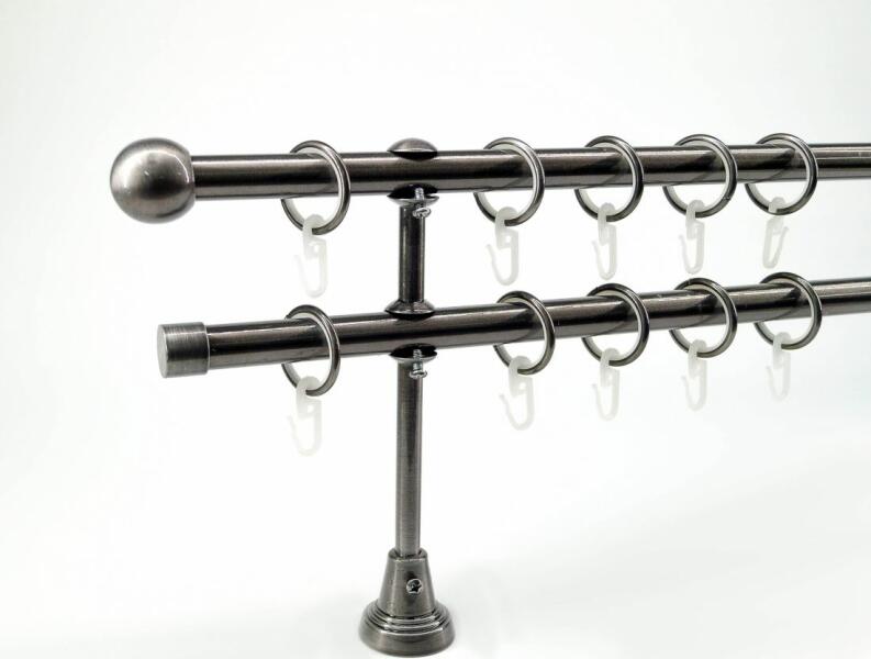 A szett tartalma: - 2 db titán színű 16 mm Ø rúd a választott méretben - 2 db titán Veszprém végzáró (2,5 cm) - 2 db titán Kansas végzáró (2 cm)- a hátsó rúdra - 2 db dupla titán nyitott tartó (11,5/17,5 cm) - titán karikák és ráncszedő kampók (rudanként, 10 cm-ként 1 db) - a szereléshez szükséges csavarok és tiplik 240 cm karnishossz felett 3 db tartót tartalmaz