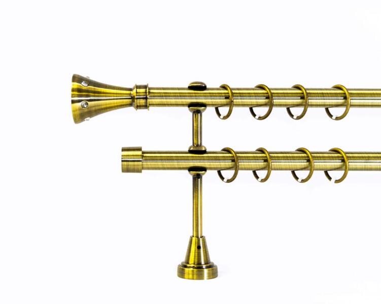 A szett tartalma: - 2 db óarany színű 19 mm Ø rúd a választott méretben - 2 db óarany Split végzáró (7 cm) - 2 db óarany Köln végzáró (2 cm)- a hátsó rúdra - 2 db dupla óarany nyitott tartó (11/17 cm) - óarany karikák ráncszedőkampóval (rudanként, 10 cm-ként 1 db) - a szereléshez szükséges csavarok és tiplik 240 cm karnishossz felett 3 db tartót tartalmaz a csomag.