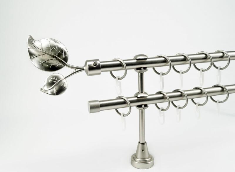A szett tartalma: - 2 db nikkel-matt színű 19 mm Ø rúd a választott méretben - 2 db nikkel-matt Lublin végzáró (7 cm) - 2 db nikkel- matt Köln végzáró (2 cm)- a hátsó rúdra - 2 db dupla nikkel-matt nyitott tartó (11/17 cm) - nikkel-matt karikák ráncszedőkampóval (rudanként, 10 cm-ként 1 db) - a szereléshez szükséges csavarok és tiplik 240 cm karnishossz felett 3 db tart