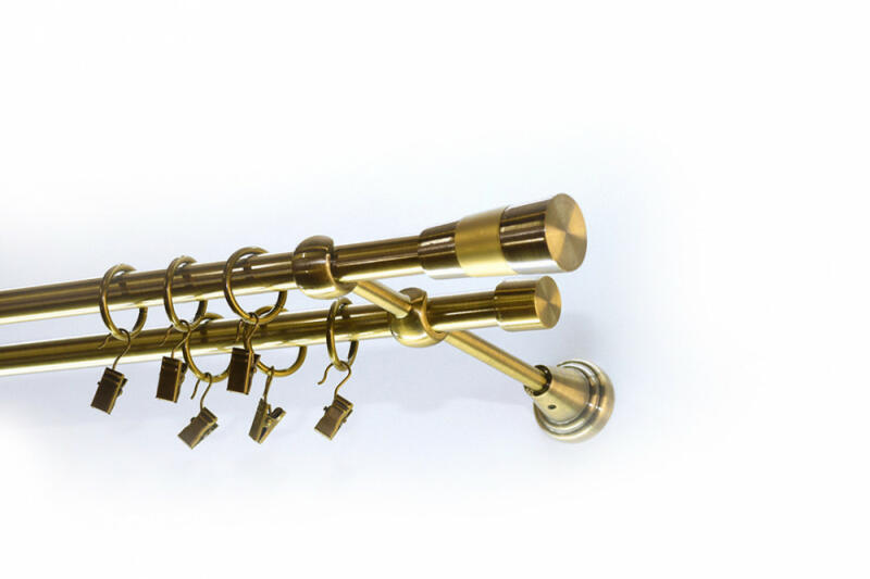 A szett tartalma: - 2 db óarany színű 16 mm Ø rúd a választott méretben - 2 db óarany St. Louis végzáró (5 cm) - 2 db óarany Kansas végzáró (2 cm)- a hátsó rúdra - 2 db dupla óarany nyitott tartó (11,5/17,5 cm) - óarany karikák és ráncszedő kampók (rudanként, 10 cm-ként 1 db) - a szereléshez szükséges csavarok és tiplik 240 cm karnishossz felett 3 db tartót tartalm