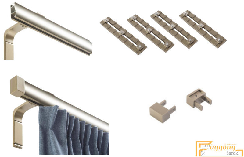 A szett tartalma: - 2 db óarany színű 16 mm Ø rúd a választott méretben - 2 db óarany Los Angeles végzáró (4 cm) - 2 db óarany Kansas végzáró (2 cm)- a hátsó rúdra - 2 db dupla óarany block tartó (8/14 cm) - óarany karikák és ráncszedő kampók (rudanként, 10 cm-ként 1 db) - a szereléshez szükséges csavarok és tiplik 240 cm karnishossz felett 3 db tartót tartalmaz a