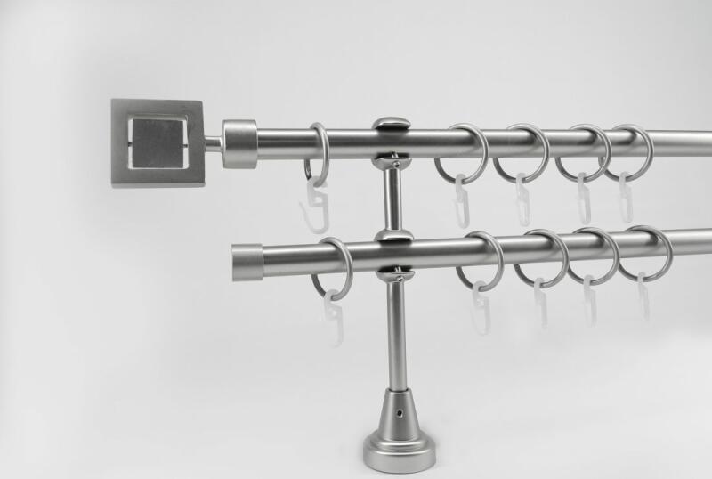 A szett tartalma: - 2 db nikkel-matt színű 16 mm Ø rúd a választott méretben - 2 db nikkel-matt Veszprém végzáró (2,5 cm) - 2 db nikkel- matt Kansas végzáró (2 cm)- a hátsó rúdra - 2 db dupla nikkel-matt lapostartó (8,5/14,5 cm) - nikkel-matt karikák ráncszedőkampóval (rudanként, 10 cm-ként 1 db) - a szereléshez szükséges csavarok és tiplik 240 cm karnishossz felett 3 db