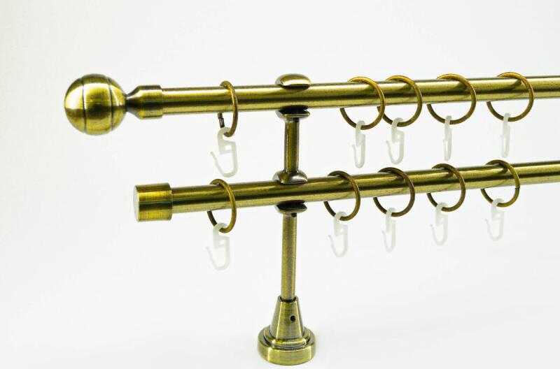 A szett tartalma: - 2 db óarany színű 16 mm Ø rúd a választott méretben - 2 db óarany New Orleans végzáró (5 cm) - 2 db óarany Kansas végzáró (2 cm)- a hátsó rúdra - 2 db dupla óarany nyitott tartó (11,5/17,5 cm) - óarany karikák és ráncszedő kampók (rudanként, 10 cm-ként 1 db) - a szereléshez szükséges csavarok és tiplik 240 cm karnishossz felett 3 db tartót tarta