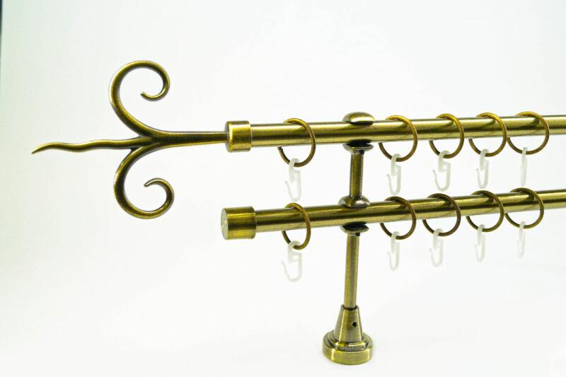 A szett tartalma: - 2 db óarany színű 16 mm Ø rúd a választott méretben - 2 db óarany Aspen végzáró (4,5 cm) - 2 db óarany Kansas végzáró (2 cm)- a hátsó rúdra - 2 db dupla óarany lapostartó (8,5/14,5 cm) - óarany karikák és ráncszedő kampók (rudanként, 10 cm-ként 1 db) - a szereléshez szükséges csavarok és tiplik 240 cm karnishossz felett 3 db tartót tartalmaz a c
