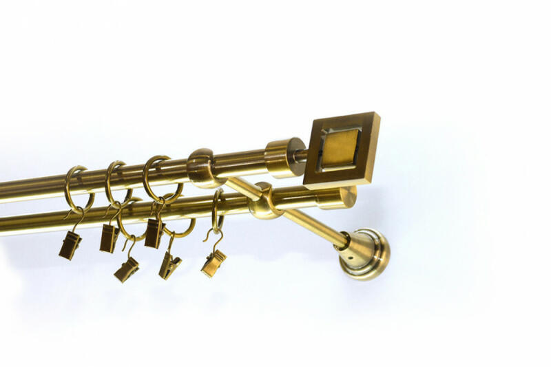 A szett tartalma: - 2 db óarany színű 16 mm Ø rúd a választott méretben - 2 db óarany Atlanta végzáró (8,5 cm) - 2 db óarany Kansas végzáró (2 cm)- a hátsó rúdra - 2 db dupla óarany lapostartó (8,5/14,5 cm) - óarany karikák és ráncszedő kampók (rudanként, 10 cm-ként 1 db) - a szereléshez szükséges csavarok és tiplik 240 cm karnishossz felett 3 db tartót tartalmaz a