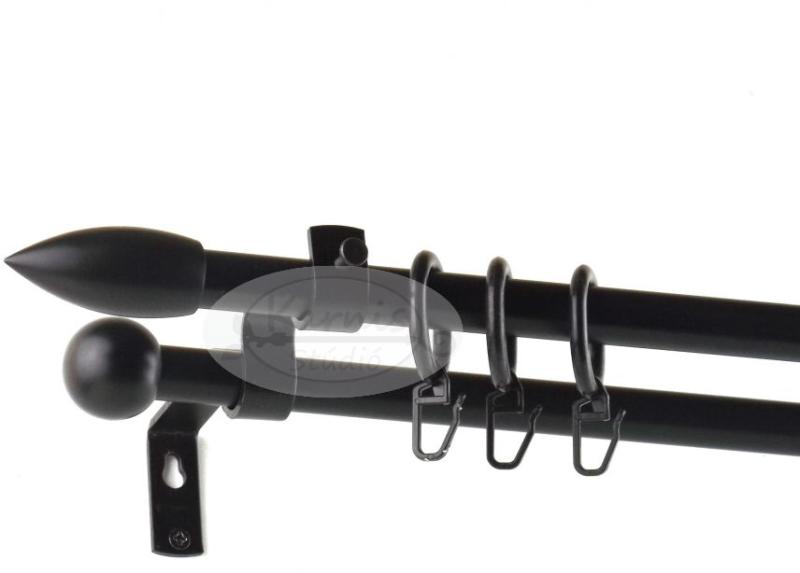 Termék részletekA VILLÁNY fekete 200 cm-es, 2 rudas, modern tartós fém karnis szett tartalma: 2 db 200 cm-es fekete színű, 16 mm átmérőjű fém karnisrúd 4 db Villány típusú kis kupak végzáró 2 db falra szerelhető fém konzol 40 db fekete műanyag függönykarika ráncszedő kampóval