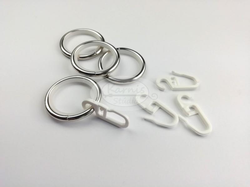 16 és 19 mm átmérőjű fém karnisrúdhoz való szilikon betétes nemesfém színű függönykarika (csöndesgyűrű / néma függönykarika) ráncszedő kampókkal 10 db / csomag 5 mm fejű ráncszedő kampó illik hozzá A karika belső átmérője: 24 mm Külső átmérője: 32 mm