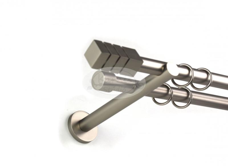 A PROTOS nikkel-matt színű 2 rudas karnis szett tartalma: 2 db nikkel-matt színű fém karnisrúd a kiválasztott hosszúságban 2 db Protos nikkel-matt színű fém karnis végzáró 2 db Alfa (kupak formájú) nikkel-matt színű fém karnis végzáró a szükséges mennyiségű nikkel-matt színű fém karnistartó konzol a felszereléshez szükséges tiplik és csavarok a karnisrudak hossz