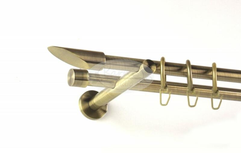 A DETROIT óarany színű, 320 cm-es, 2 rudas, modern tartós fém karnis szett tartalma: 4 db 160 cm-es óarany fém karnisrúd 2 db toldó elem 2 db Detroit típusú óarany színű fém végzáró 2 db Kansas típusú kis kupak végzáró 3 db falra szerelhető modern fém konzol 64 db óarany színű műanyag karika ráncszedő kampóval
