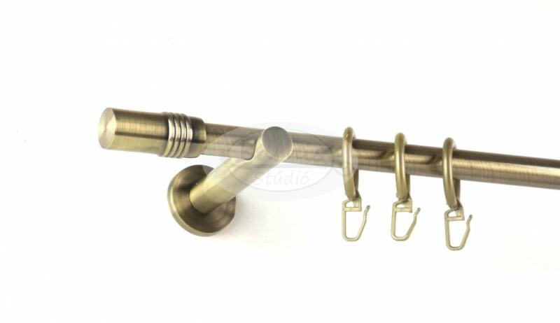 A NEW ORLEANS óarany színű 160 cm-es, 1 rudas fém karnis szett tartalma: 1 db 160 cm-es óarany színű, 16 mm átmérőjű fém karnisrúd 2 db New Orleans típusú óarany színű fém karnis végzáró 2 db falra szerelhető fém konzol 16 db óarany színű műanyag függönykarika ráncszedő kampóval