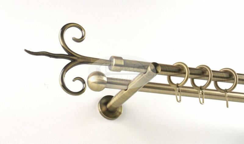 A KECSKEMÉT óarany színű, 200 cm-es, 2 rudas, modern tartós fém karnis szett tartalma: 2 db 200 cm-es óarany fém karnisrúd 2 db Kecskemét típusú óarany színű fém végzáró 2 db Veszprém típusú kis gömb végzáró 2 db falra szerelhető modern fém konzol 40 db óarany színű műanyag karika ráncszedő kampóval