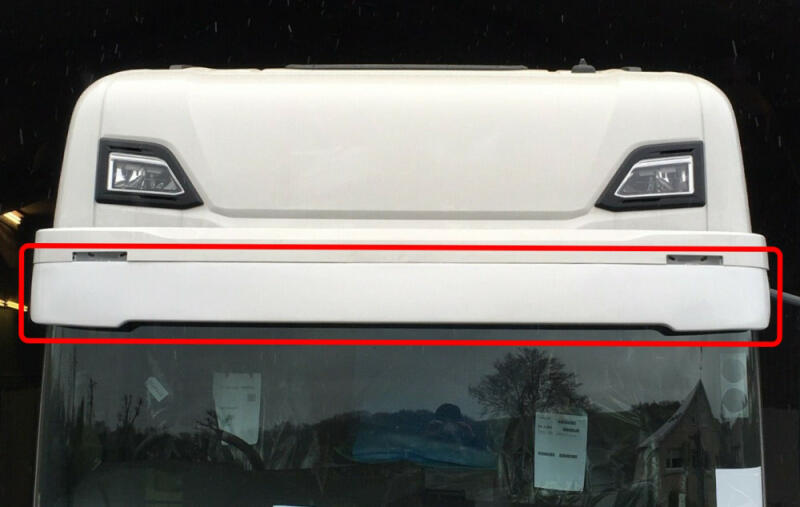 Műanyag napvédő az első szélvédő fölé. A kétrészes napvédő alsó (nem átlátszó) része. Festéshez előkészített felülettel. A felső rész alá is benyúlik, közös rögzítése van. Teljes szélessége: 228 cm Magassága: 17 cm Teljes magassága (rögzítőperemmel együtt): 28 cm Típus: - Scania R széria 2017-től