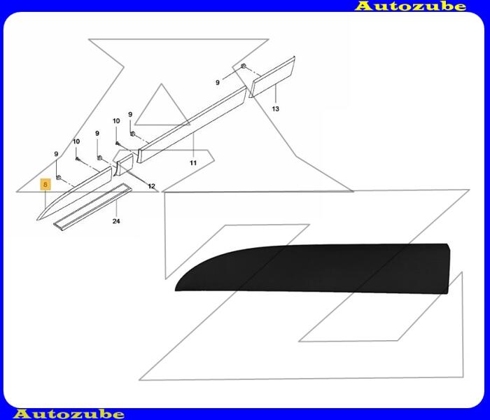 E. ajtó díszléc bal, alapozott (4/5 ajtós+Kombi) Minden termékünk új, utángyártott. A karosszéria elemek nem színre fényezettek, az alapozás színe is eltérő lehet a képen látható színtől! Esetleges készlethiányok előfordulhatnak.