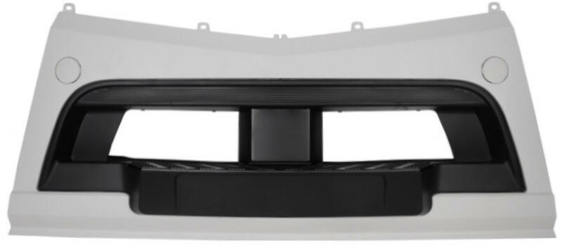 Műanyag lökhárító elem. A három részes lökhárító középső része. Alsó díszperemmel ellátott kivitel. Fekete belsővel és fehér kerettel (festéshez). Magassága: - középen: 58 cm - szélén: 67 cm Szélessége: - a felső sarkai között: 126 cm - az alsó sarkai között: 158 cm Típus: - Mercedes Actros MP4 2012-től magas lökhárítóval (alsó díszperemmel ellátott vál