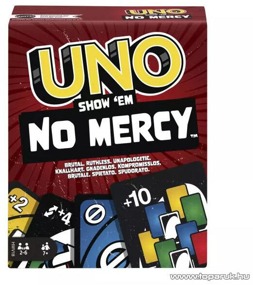Az UNO Nincs kegyelem az eddigi legbrutálisabb UNO változat! Sokkal több kártya van benne, sokkal keményebb büntetéssel, mint valaha - húzz 10 lapot... - kegyetlen. Az új szabályokkal, amelyeknek köszönhetően a játékosok több lapot halmozhatnak fel, cserélhetnek és húzhatnak biztosan hatalmas csaták és vidámság alakul ki, és még egy irgalomszabály is létezik, - igen, iro