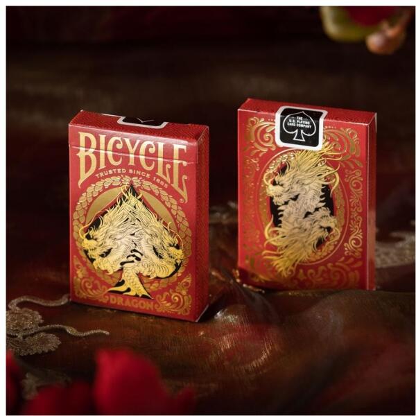 Az eredeti, angol nyelvű ismertető:Celebrate strength and good fortune in the Year of the Dragon with Bicycle Red Dragon playing cards!Custom court cards dressed in kimono‐inspired garments will bring a unique flare to your next game; and the brilliant, gold foil framing around the dragons on the tuck case are sure to be show‐stoppers. FEATURESCUSTOM CARD BACK DESIGN – Dual golden dragons