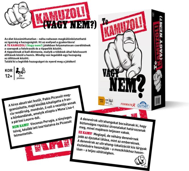 Gyártó: OutSet Modell: Te kamuzol! Vagy nem ? társasjáték kártyákkal Leírás: Neked van szimatod a kamuzás felismeréséhez ? Találd ki a legtöbb hazugságot és nyerd meg a játékot! Most kiderül mennyire érzel rá a valóságra vagy a abszurd dolgokra. Vajon nehéz megkülönböztetni az igazságot a hazugságtól, főleg ha az állítások nem mindennapiak ? Itt az esélyed a gyak