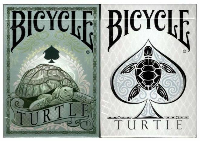 A Bicycle Turtle (teknős) kártya mindkét változata (Land és Sea) együtt, dupla csomagos kiszerelésben. Az eredeti, angol nyelvű ismertető:A completely custom turtle themed limited edition Bicycle poker size deck suitable for all your playing card needs. Makes a great gift for the turtle lover in your life or for anyone who appreciates great design. Previous decks in the critter series sol