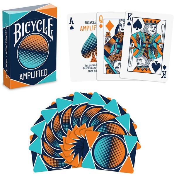 Tökéletes színkombináció akár cardistryhez, akár bűvészkedéshez! A Bicycle Amplified csomag egy igazán lenyűgözõ mintázattal büszkélkedhet a hátoldalán: narancssárga, kék, világoskék és fehér színek sorakoznak rendezett formákban, mely garantáltan magához vonzza a nézõk figyelmét. A kártyák az Egyesült Államok kártyagyárában készültek, és a szokásos, kiv