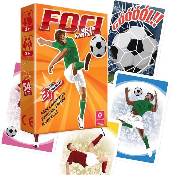 Foci meccskártya 3 az 1-ben - Cartamundi A kártya három különböző szabály szerint, Fekete Péter, kvartett és Meccs kártya játszható. MECCS Kártya: Két csapat egymással szemben, piros és zöld színben, dobókockával felváltva vezetjük a támadást, a kockán lévő színek segítségével, végül egy jól irányzott "dobással" találjuk meg a GÓÓÓL kártyát, és lőjük b