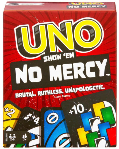 Készüljenek fel egy elképesztő kártyajátékra az UNO No mercy - Nincs kegyelem pakli jóvoltából ! Ez a különleges és extra kihívásokat tartogató kiadás már 7 éves kortól játszható, és mindazoknak ajánlott, akik imádják az akciódús pörgést, a lehetetlen helyzeteket, illetve a kiszámíthatatlan pillanatokat. Ebben a játékban ugyanis csak az győzhet, aki bátran játs