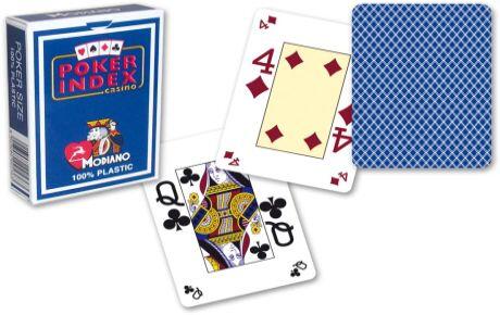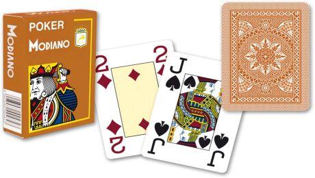 Minőségi kedvenc márkájú Modiano póker kártya 100% műanyagból. Kártyáknak klasszikus szélesvásznú formátuma van, 8,89 cm magasak és 6,35 cm zélesek. Kártyák négysarkűak -minden sarokban van egy érték index. Modiano kártyák nagyon népszerűek a rendszeres játékosoknál, mert magas élettartamuk van és ellenállók. Köszönhetően az összetételnek 100% műanyagnak eze