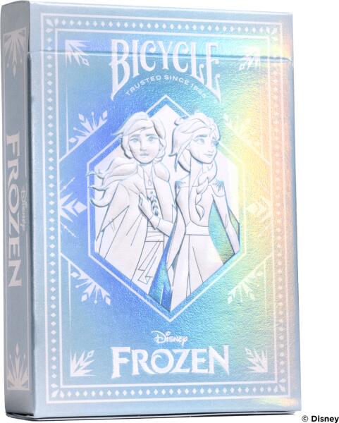 Az eredeti, angol nyelvű ismertető:Immerse yourself in the magical world of Arendelle with Disney Frozen Inspired Playing Cards by Bicycle!The icicle blues of the card backs and holographic foil snowflake on the tuck case will turn your next card game into a winter wonderland. Elsa, Anna, Olaf, Sven and more fill the court cards with charisma!
