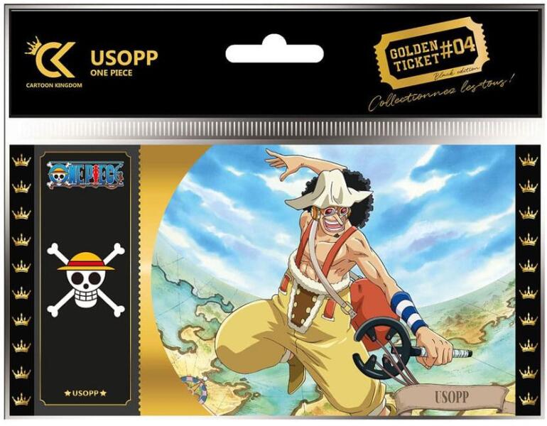 One Piece Golden Ticket Black Edition Usopp #04Golden Tickets are the latest collectible craze for anime fans! In the exclusive Black Edition, each ticket is numbered and once a design is sold out, it will not be reproduced. Made from tear-resistant, washable PVC paper, each ticket is carefully printed in HD quality and then finished with a thin, high-gloss coating. This Golden Ticket measuring ap