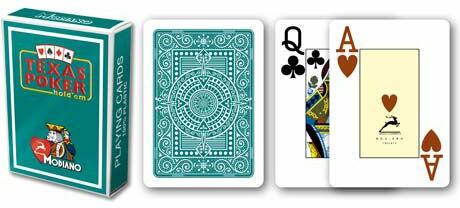 Minőségi kedvenc márkájú Modiano póker kártya 100% műanyagból. Kártyáknak klasszikus szélesvásznú formátuma van, 8,89 cm magasak és 6,35 cm zélesek. Kártyák kétsarkűak - átellenes sarokban kártja értéke van feltűntetve. Modiano kártyák nagyon népszerűek a rendszeres játékosoknál, mert magas élettartamuk van és ellenállók. Köszönhetően az összetételnek 100%