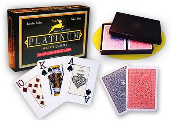 A Modiano Platinum Acetate kártya különlegessége leginkább az anyaga: a megszokott 100% plasztik helyett ez plasztik-acetátból készült, ami egyesek szerint a póker kártyák evolúciójának a következő lépcsőfoka. Ez az anyag tartósabb a plasztiknál, jobban hajlik, viszont kevésbé törik, és a súlyozása miatt szebben is röpül. A dupla paklis csomagban két pakli Modiano Pla