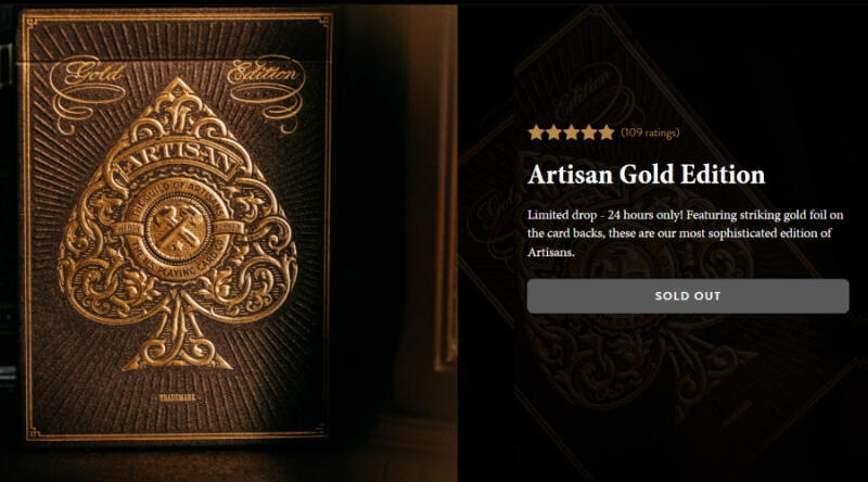 Az eredeti, angol nyelvű ismertető:Artisan Gold Edition playing cards are the rarest of the rare. Only obtainable in extremely limited quantities at Target stores in the USA, or as prizes or promotions on theory11. com - Artisan Gold Edition have never before been available for normal purchase. Until now. Draped in GOLD. Featuring the Artisan design that you love, this time using striking gold f