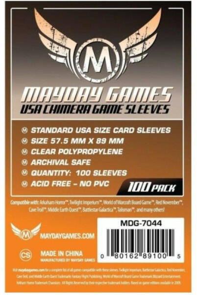 Ha az ön társasjátékai és kártyajátékai is tartalmaznak 57,5 x 89 mm -es kártyalapokat, akkor célszerű elgondolkodnia azon, hogy egy praktikus védelemmel látja el őket a strapabíróság érdekében. A Mayday Games USA Chimera kártyavédő csomagban összesen 100 db átlátszó polipropilén ből készült tasak érkezik, melyek PVC - és savmentes kivitelezésüknek köszönhetően
