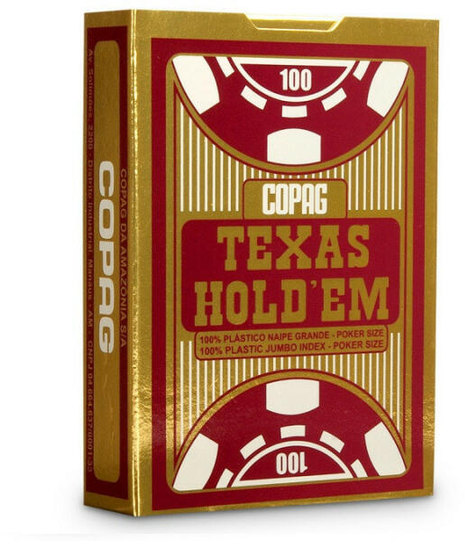 Copag Texas Hold'em Gold Red plasztik kártya - Cartamundi A Copag Texas Hold'em Gold Black plasztik kártya - Cartamundi , p rémium minőségű 100% plasztik póker kártya, jól látható, nagy index 2 sarokban, piros hátlappal. A plasztik kártyák lényegesen tartósabbak, ezért aki igazán jó minőségű kártyát szeretne, érdemes plasztik kártyát vásárolnia. Copag Texas Hold'em Gol