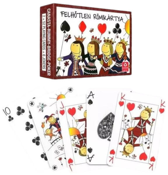 Felhőtlen dupla römi plasztik kártya - Cartamundi A francia kártya sosem megy ki a divatból, köszönhetően annak, hogy rendegeteg játékot lehet vele játszani, mint páldául: póker, fekete özvegy, canasta, rummy, bridge. A pakli lapjainak dizájnja formabontó, de mégis klasszikus. Az ábrákat a gyermekrajzok ihlették. Felhőtlen dupla römi plasztik kártya - Cartamundi jellemzői: