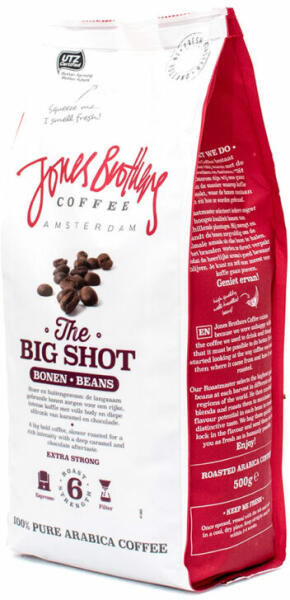 A Jones Brothers Coffee The Big Shot kávéja egy erőteljes, sötét pörkölésű arabica keverék, amely közép- és dél-amerikai kávékat tartalmaz. Az intenzív ízvilágot a finom karamell, sötét csokoládé, fűszeres jegyek és egy csipetnyi cseresznye íz adja. Erős testével és gazdag karakterével ideális eszpresszó vagy más erősebb kávéitalok készítésére. A kávéban a