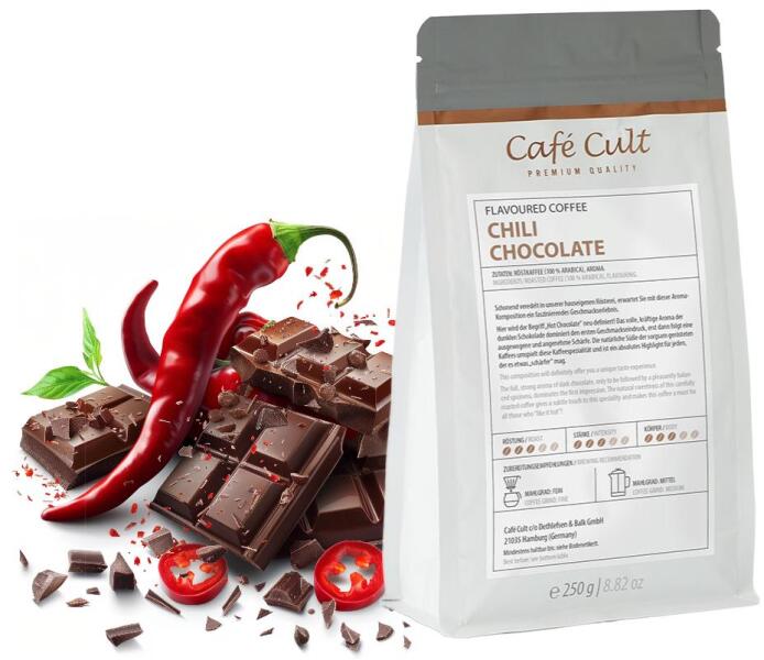 Fedezze fel a kávézás egyedülálló dimenzióját a Café Cult Chilis-csokis ízesítésű pörkölt szemes kávéval! Ez a különleges blend a legkiválóbb minőségű Arabica kávészemekből készült, gondosan válogatva, hogy egy valóban prémium kávéélményt nyújtson. A kávé mély, gazdag ízvilága tökéletes harmóniát alkot a finoman csípős chili és az ellenállhatatlan