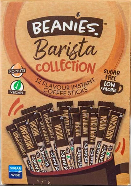 Beanies Ízesített azonnal oldódó kávé válogatás 12x2g. A dobozban a következõ ízek találhatóak: americano, cappucino, mocha Alacsony kalória Hozzáadott cukormentes Mogyorót nem használó üzemben készül Vegetáriánusok és vegánok is fogyaszthatják Gluténmentes, gabonamentes és tejmentes