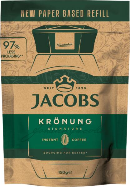 Ez a termék 97%-kal kevesebb csomagolóanyagot tartalmaz, mint a 200 g-os, tetővel ellátott üveges Jacobs termék egy gramm kávéra vonatkoztatva.