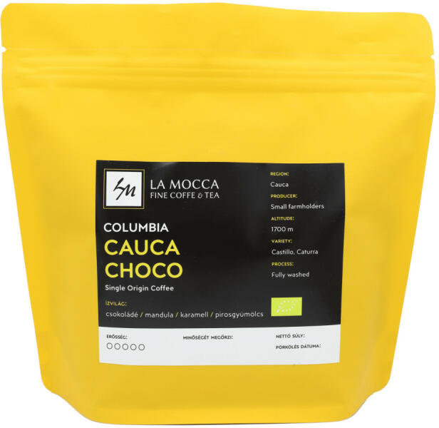 Columbia choco Márka : La Mocca szemes kávé Ízvilág: csokoládé , mandula , karamell, pirosgyümölcs Ország: Columbia Régió: Cauca Farmer: Kisebb farmgazdálkodók Termőhely tengerszintfeletti magassága: 1700 m Variáns: Castillo, Caturra Feldolgozás: Fully Washed CHOCO, egy csésze kávé ínyenc jegyekkel A „CHOCO név ennek a kávénak az ízprofiljára utal. A csészében a csok