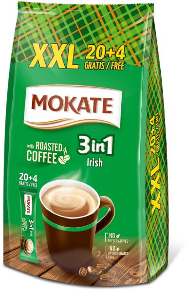 Mokate xxl 3:1 irish cream 24x17g Hivatalos magyarországi forgalmazótól. Összetevők: Cukor, Glükózszirup, Kókuszolaj, Kávé [instant kávé (8,95%), finomra őrölt pörkölt kávé (0,05%)], Sovány kakaópor, Tejfehérje, Savanyúságot szabályozó anyagok: dikálium-foszfát, Aromák, Emulgeálószer: zsírsavak mono- és digliceridjei A termék szóját és glutént tartalmazhat. Tá