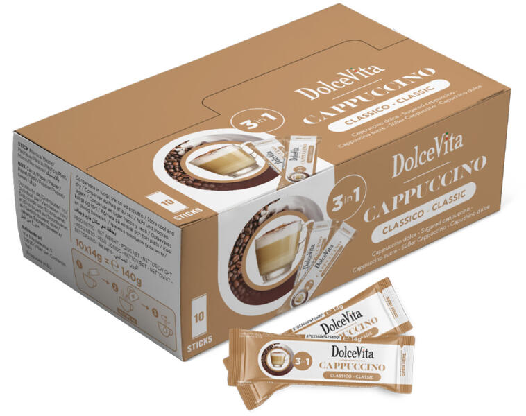 Felfrissítő élmény egy csésze Dolce Vita Cappuccino Classicoban! Azonnal elkészíthető kávé, ami ízében és krémességében verhetetlen. Édes, mégsem túlzottan, pont, ahogy egy igazi cappuccinónak lennie kell. Egy csomagban 10 praktikus kiszerelésű instant kávépálca található, így kényelmesen magaddal viheted, bármerre is jársz. Legyen az iroda, otthon vagy épp a termé